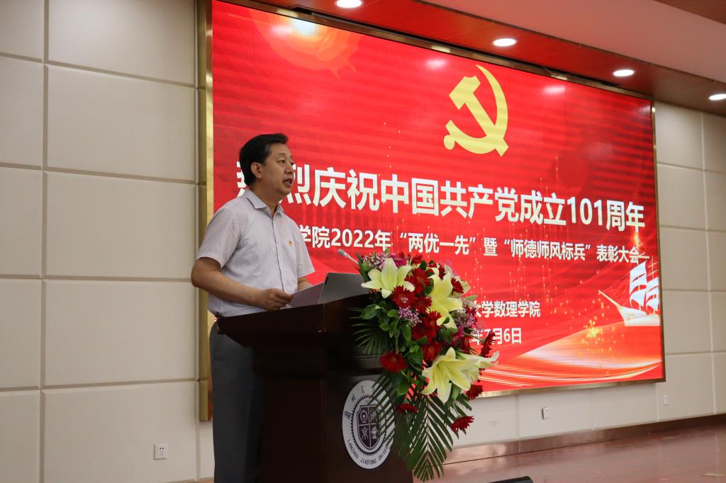 马军党在讲话中指出,数理学院隆重召开本次大会,重温党的光辉历程,传承党的优良传统,对一年来在学院推进教育教学改革发展进程中涌现出来的先进基层党组织和优秀共产党员、优秀党务工作者和师德师风建设标兵进行表彰,具有十分重要的意义。