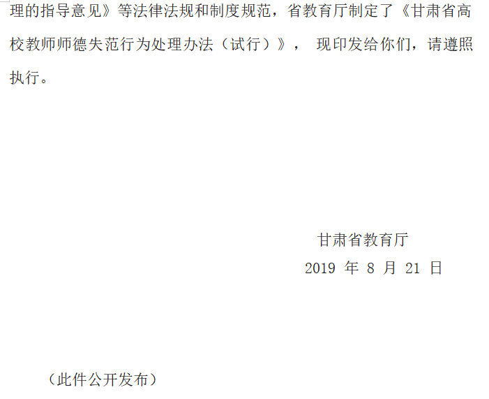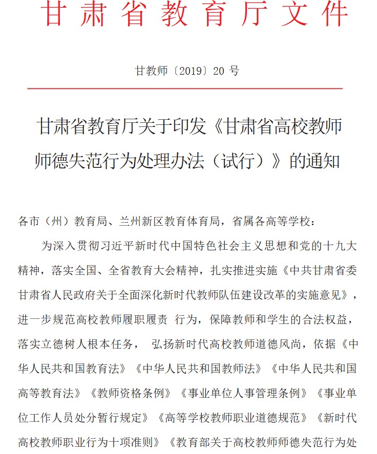 【甘肃省教育厅】甘肃省高校教师师德失范行为处理办法(试行)